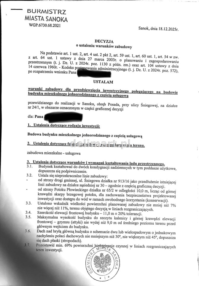 Wydane prawomocne warunki zabudowy dla przedsięwzięcia inwestycyjnego polegającego na budowie budynku mieszkalnego jednorodzinnego z częścią usługową.