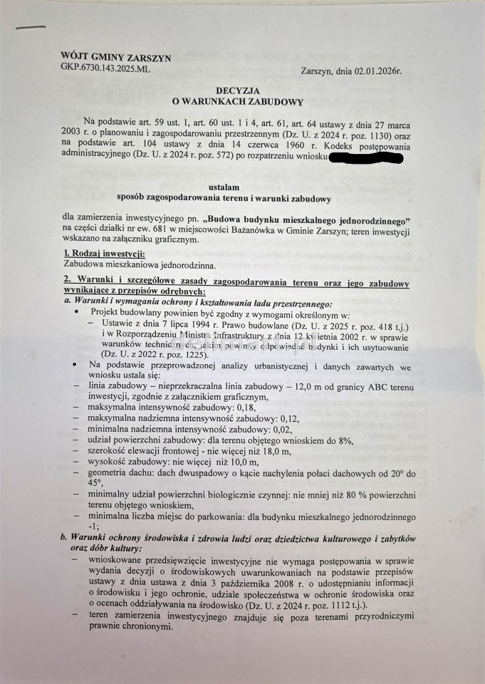 ☑️ Warunki Zabudowy wydane dn. 02.01.2026, obszar zabudowy na załączniku graficznym.